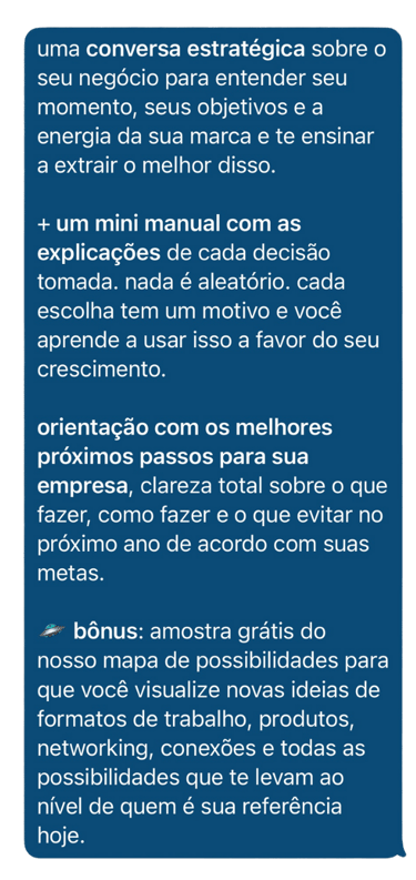 posicionamento claro, direção definida, identidade coerente, calendário organizado e sua marca finalmente ocupando o espaço que merece.